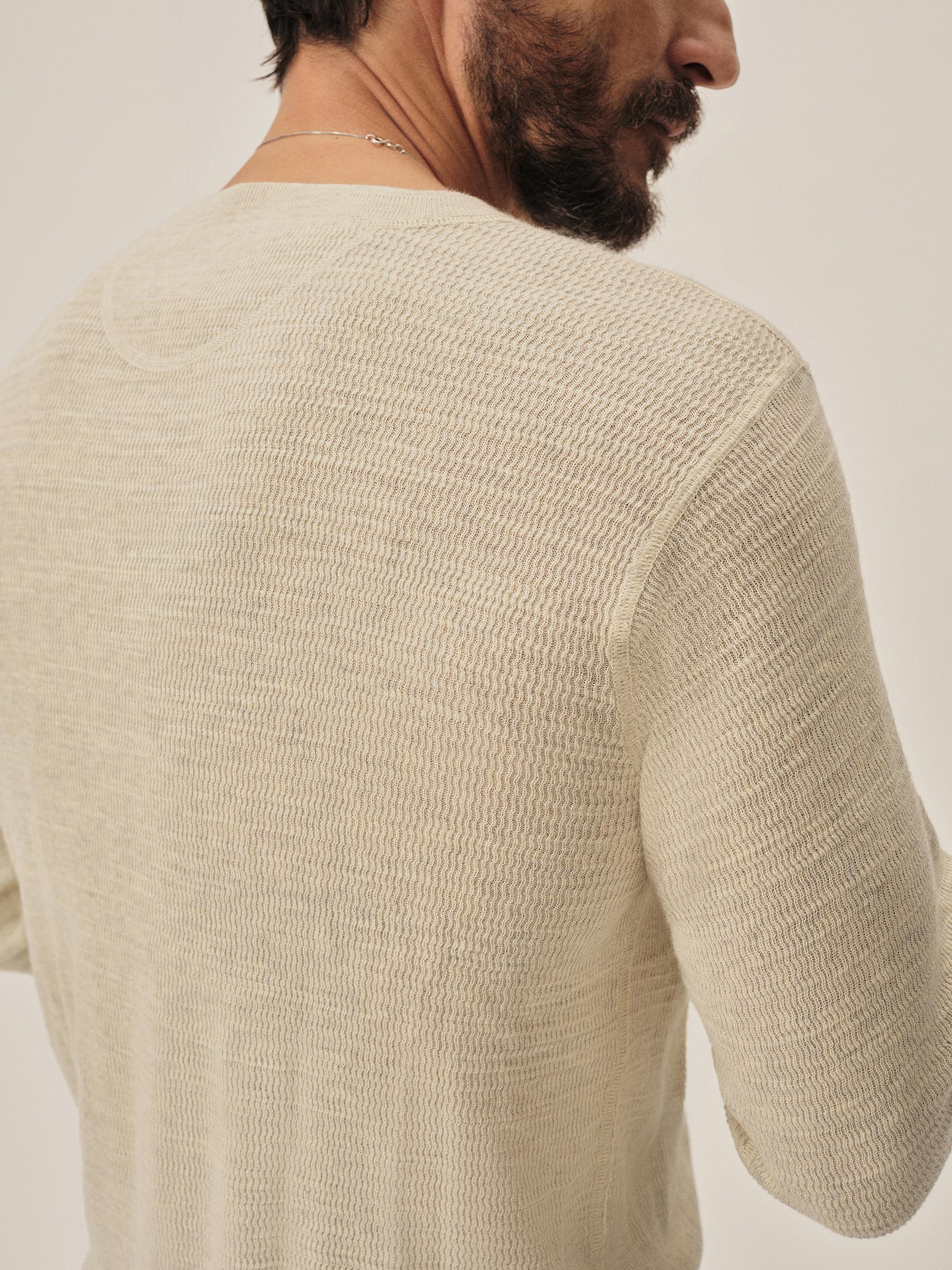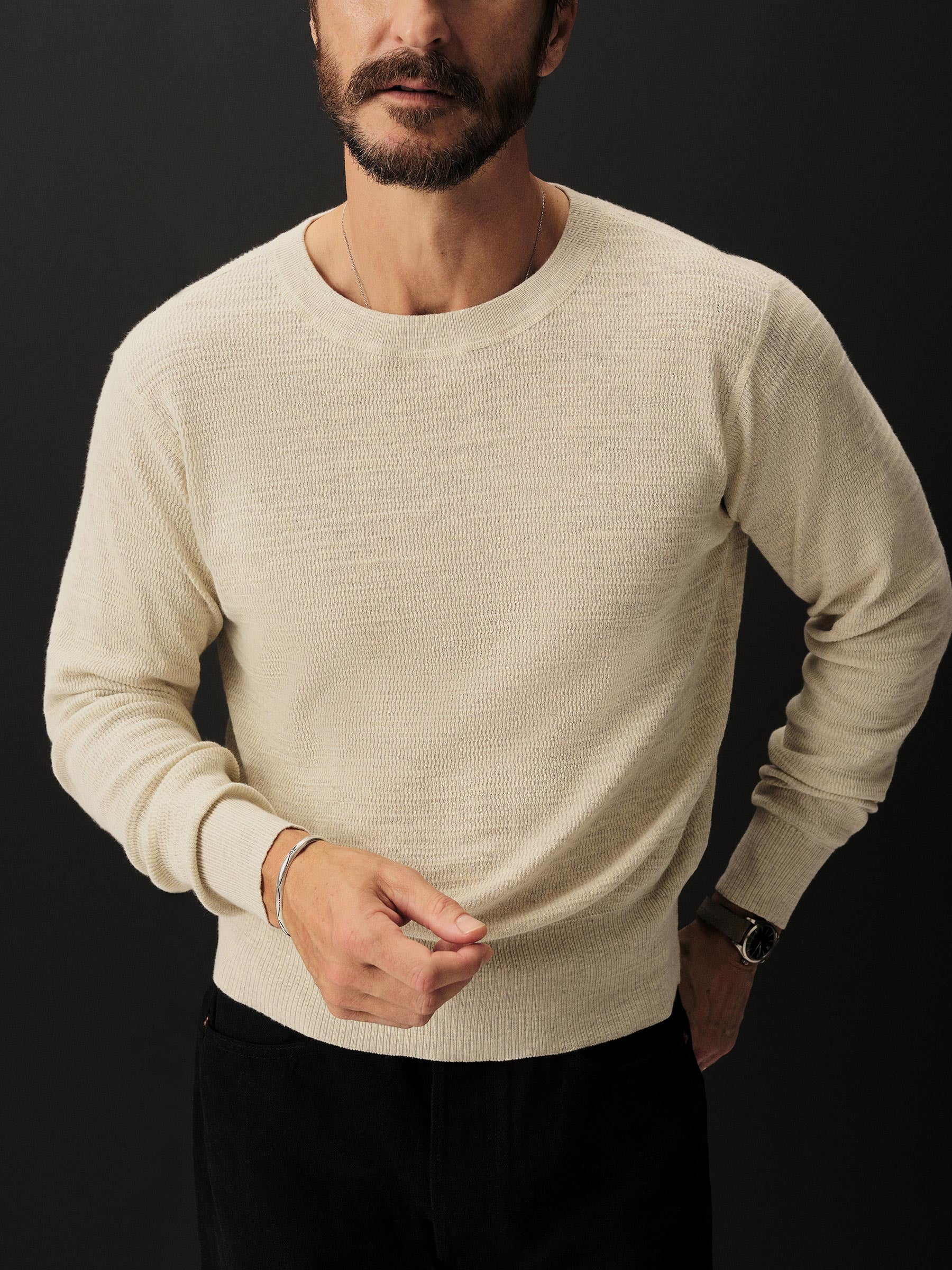 Inspired by WWII-era cut-and-sew thermals, this lightweight crew is knit from 100% slub cotton in a thermal stitch for breathable texture and vintage character. It’s finished with ribbing at the neck, cuffs, and hem, and yarn-dyed and garment-rinsed for a soft hand and broken-in feel.
