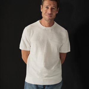 Classic fit short sleeve sweater tee with a straight hem. Yarn-dyed 16 gauge cotton jersey features light slub texture. Features double layer 1×1 ribbing at the collar and rib finishing at the cuffs and hem. Constructed with hand-linked seams for improved durability.