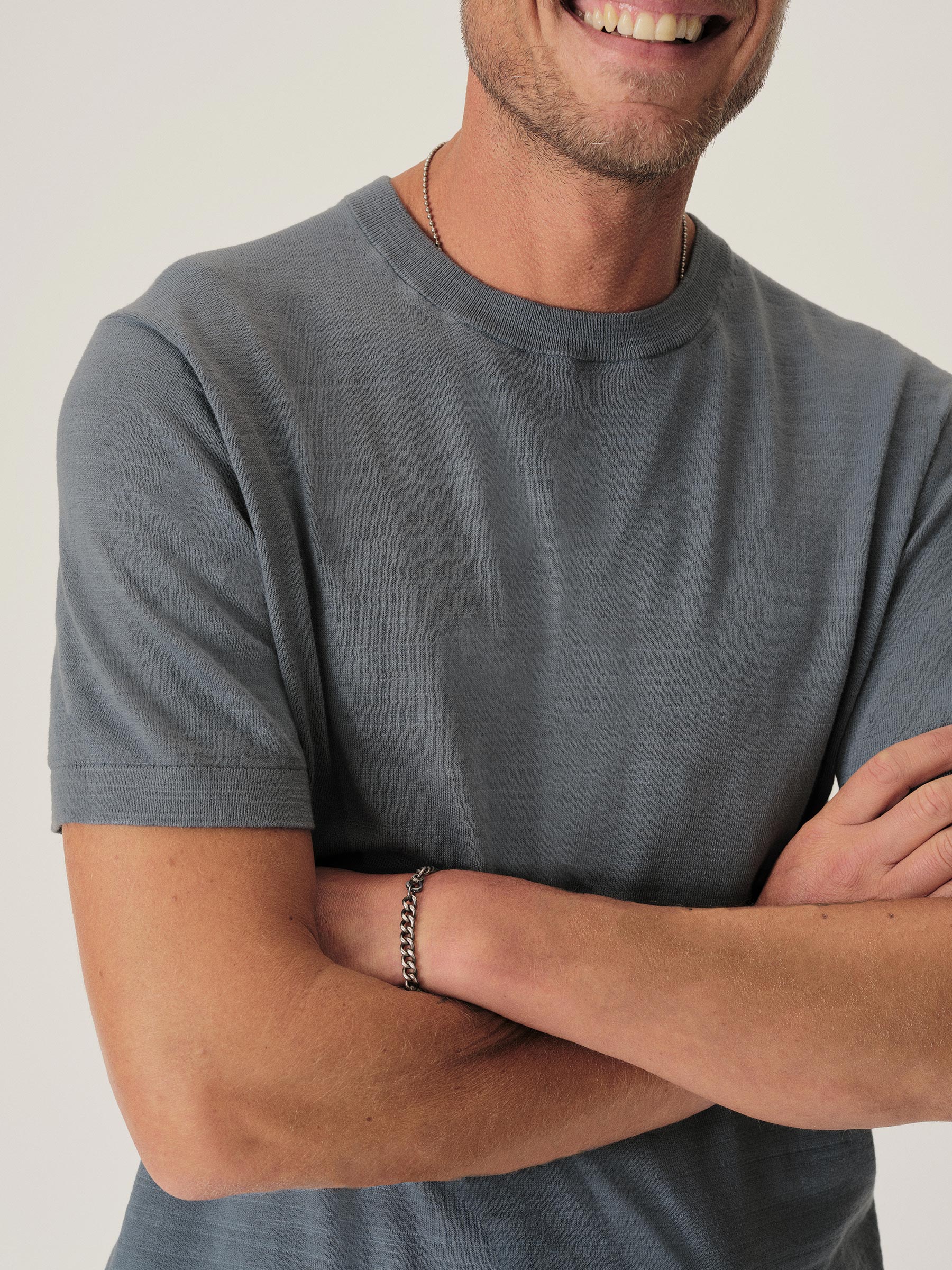Classic fit short sleeve sweater tee with a straight hem. Yarn-dyed 16 gauge cotton jersey features light slub texture. Features double layer 1×1 ribbing at the collar and rib finishing at the cuffs and hem. Constructed with hand-linked seams for improved durability.