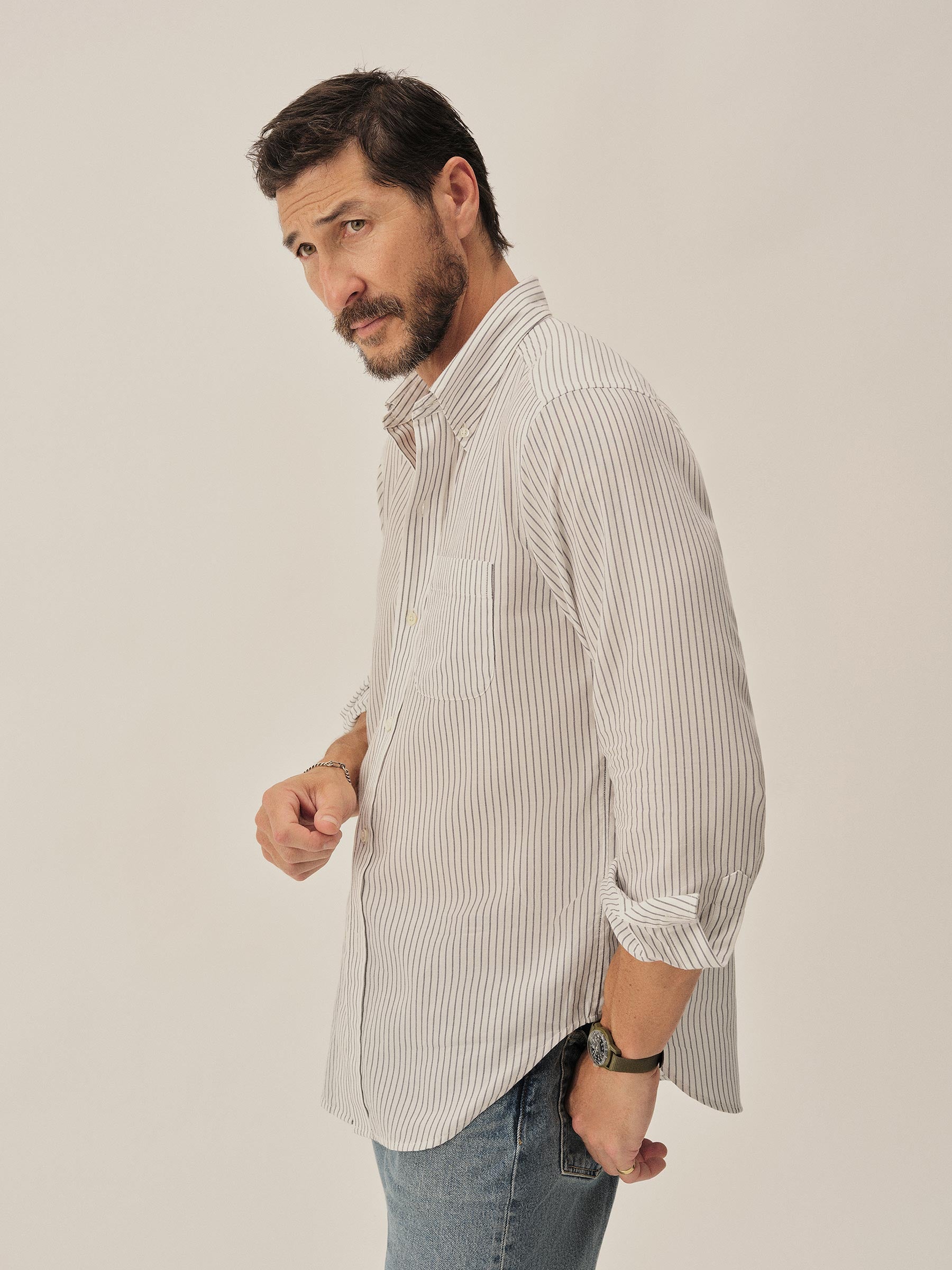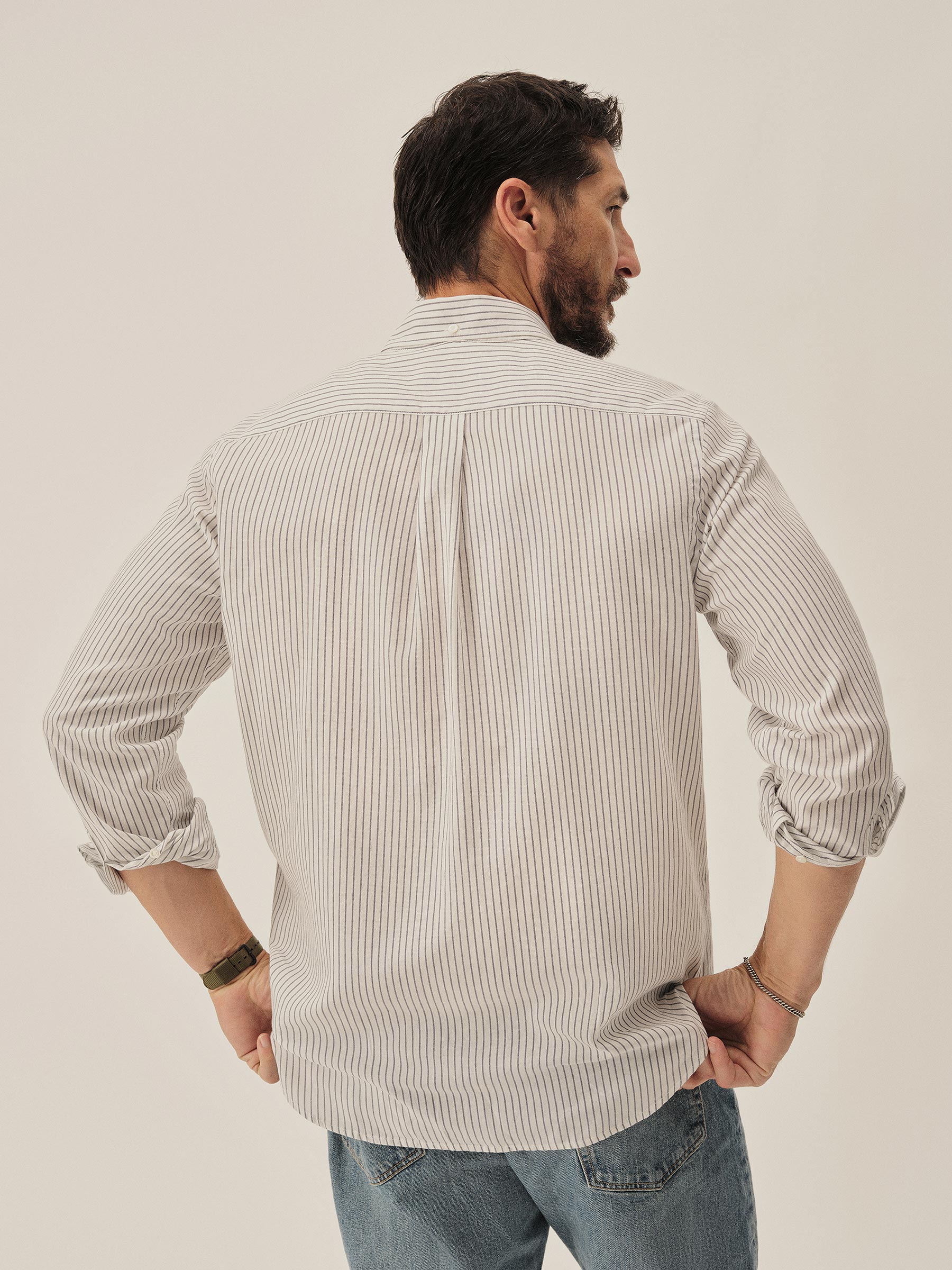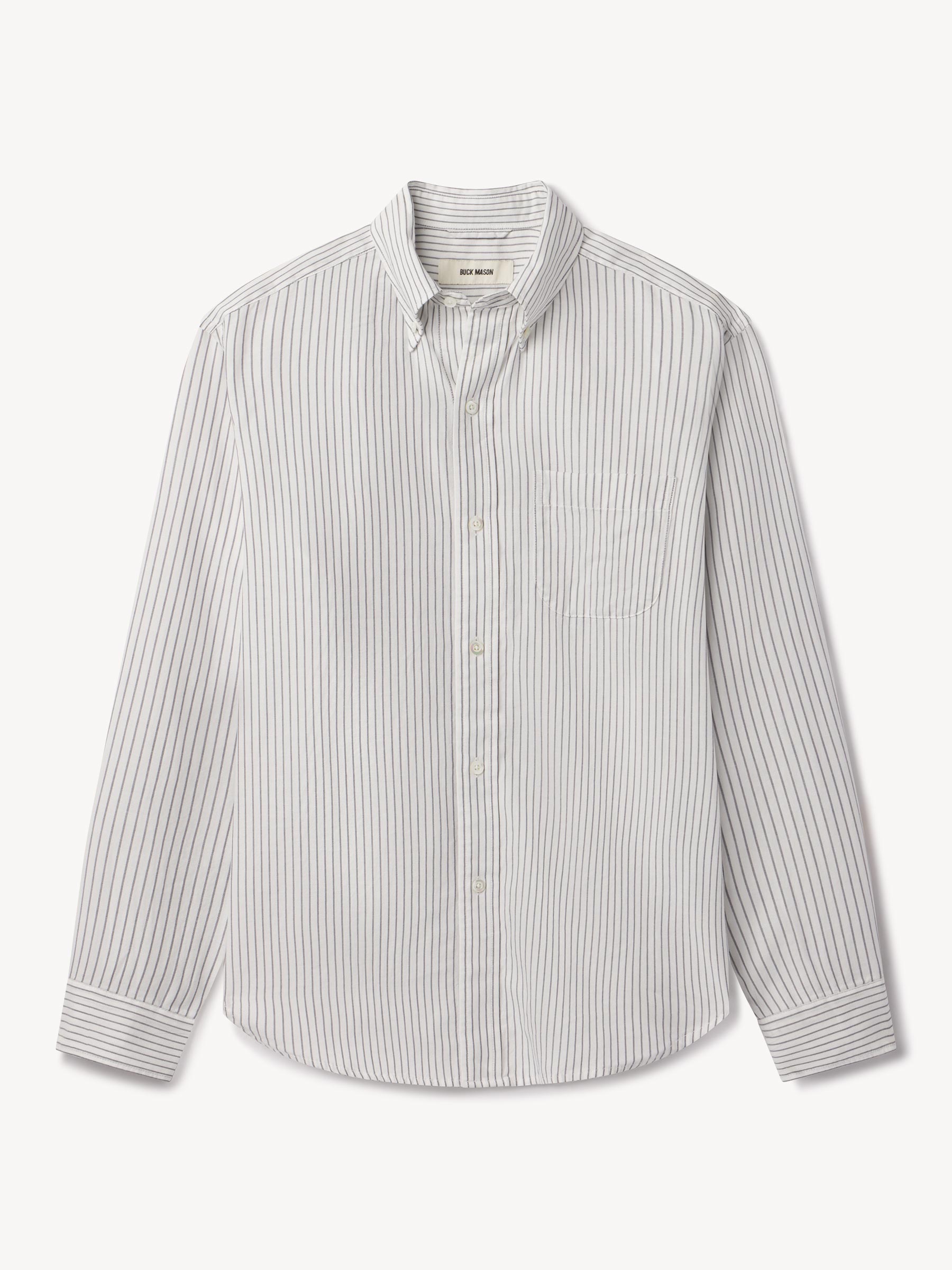 Classic fit button down collar shirt cut from a proprietary 3 oz blend of cotton and tencel. Details include mother of pearl buttons, a single scallop pocket, and a box pleat at the back. Constructed with clean finished seams. Garment washed for a lived-in look and feel.