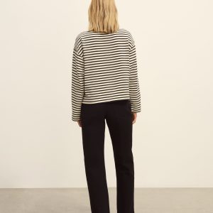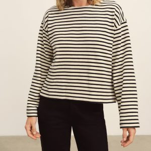 Relaxed long sleeve boatneck tee inspired by the classic French breton shirts. Cut from sturdy, compact 350 GSM cotton. Details include a taped boatneck neckline and side slits at the hem. Constructed with flatlock stitching throughout and double needle coverstitching at the hem. Garment washed for a lived-in feel.