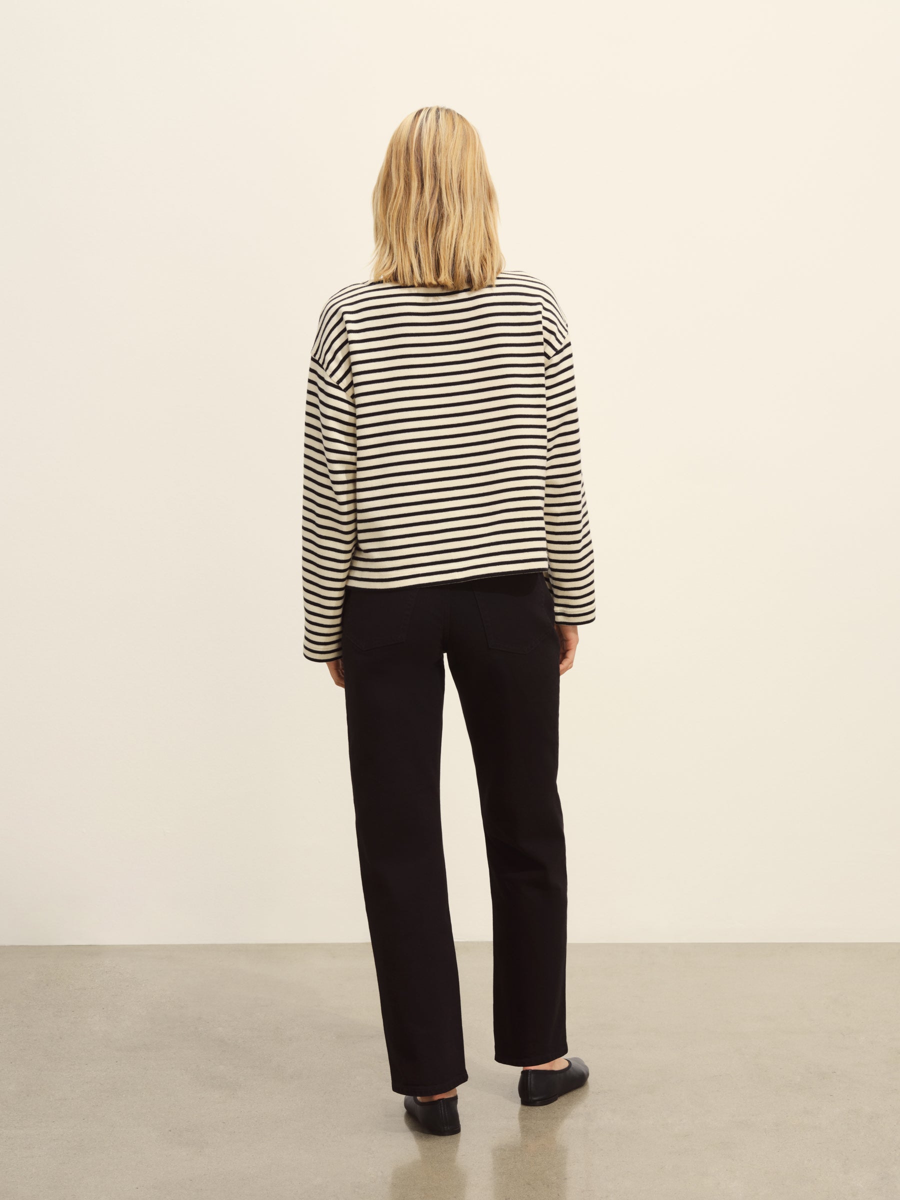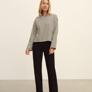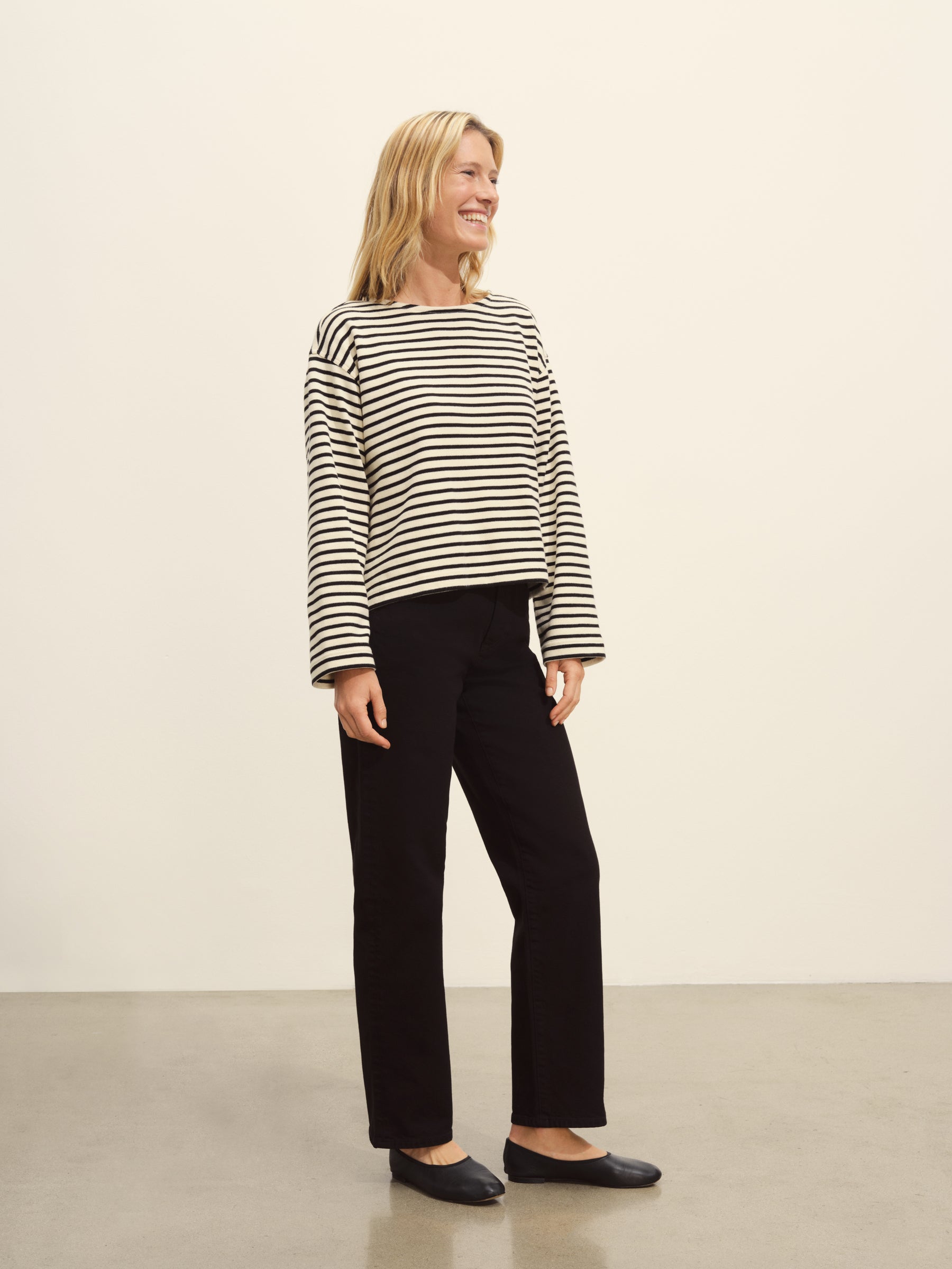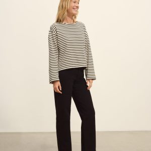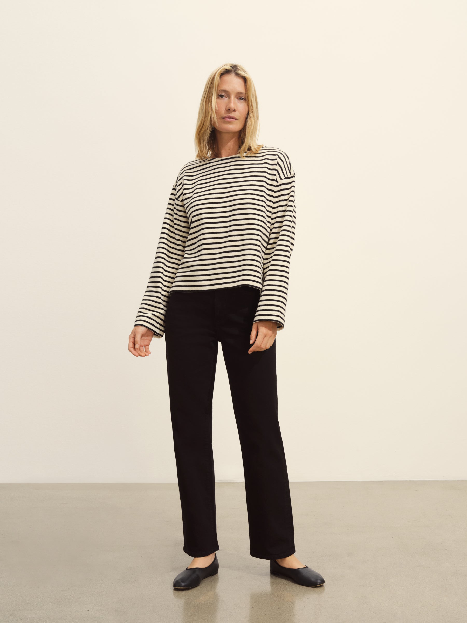Relaxed long sleeve boatneck tee inspired by the classic French breton shirts. Cut from sturdy, compact 350 GSM cotton. Details include a taped boatneck neckline and side slits at the hem. Constructed with flatlock stitching throughout and double needle coverstitching at the hem. Garment washed for a lived-in feel.