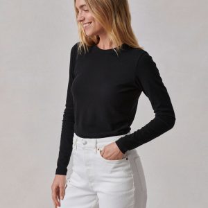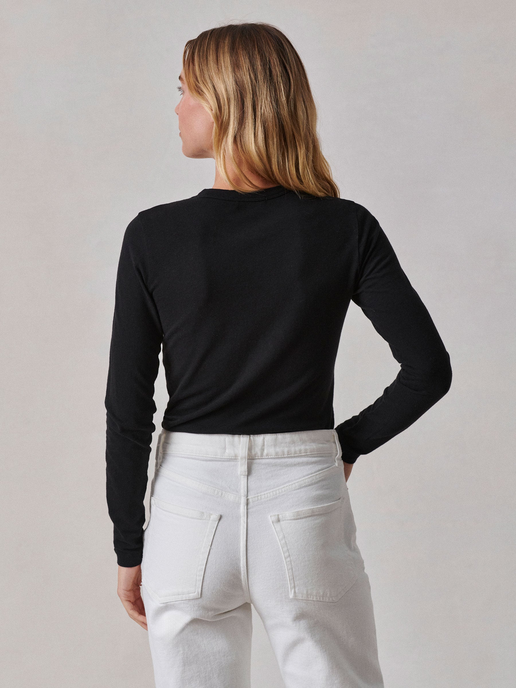 Slim fit long sleeve crewneck tee cut from a supersoft 130 GSM blend of bamboo, cotton, and wool. Features a straight hem, a self bound neck, and raised armholes that hug the contours of the shoulders. Garment washed for a lived-in feel.