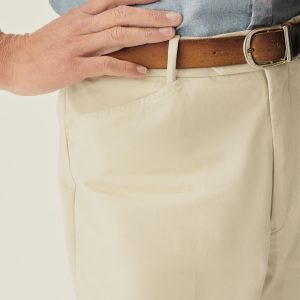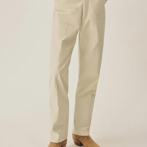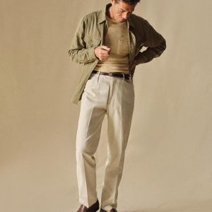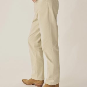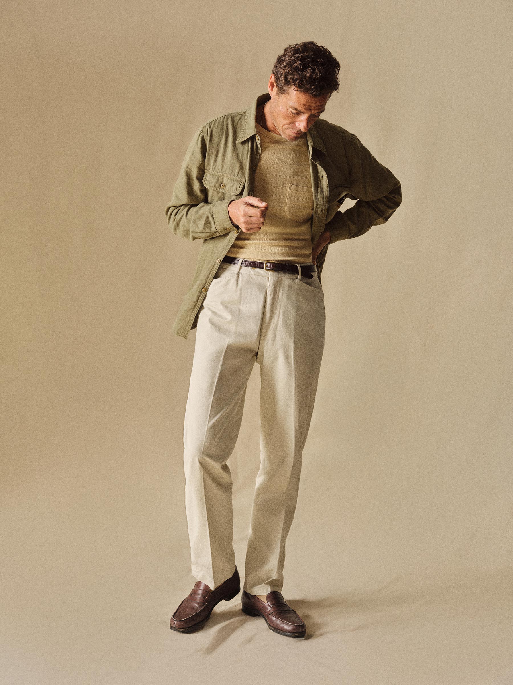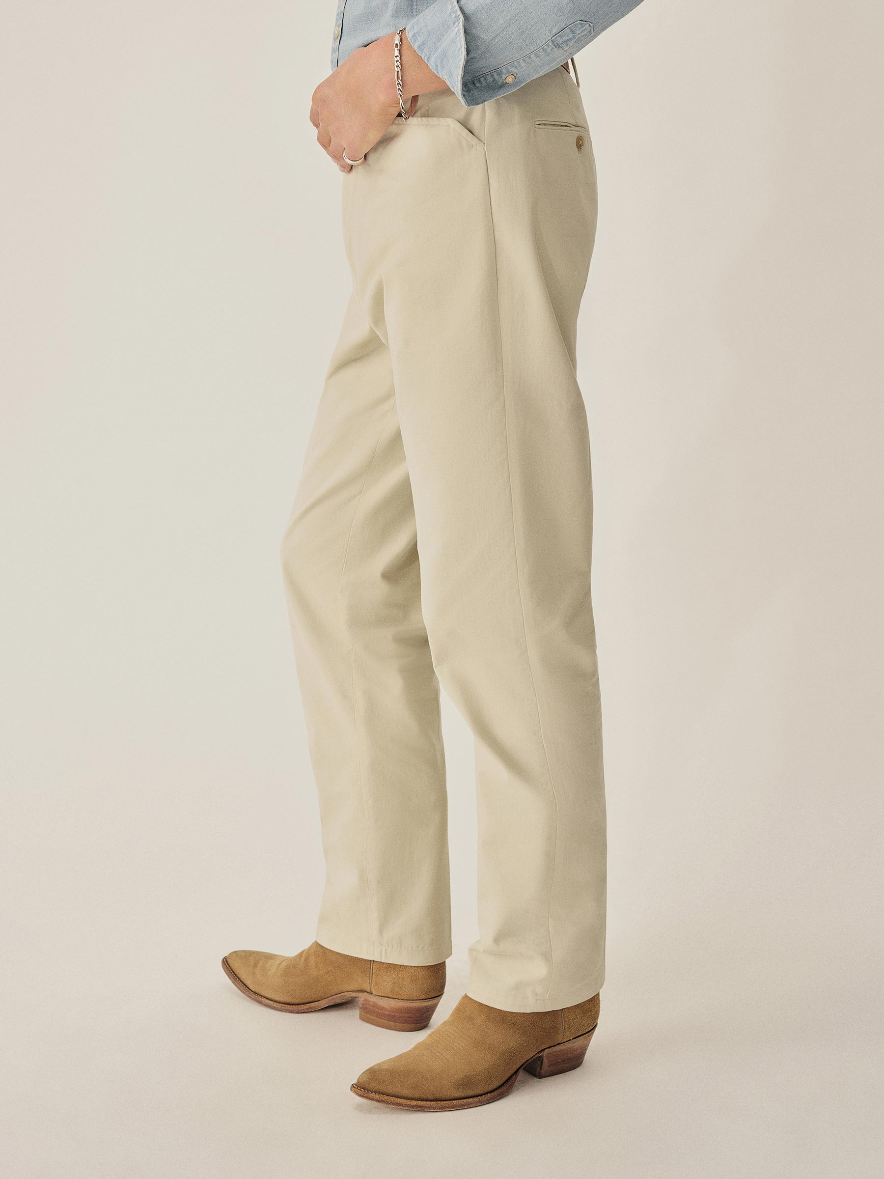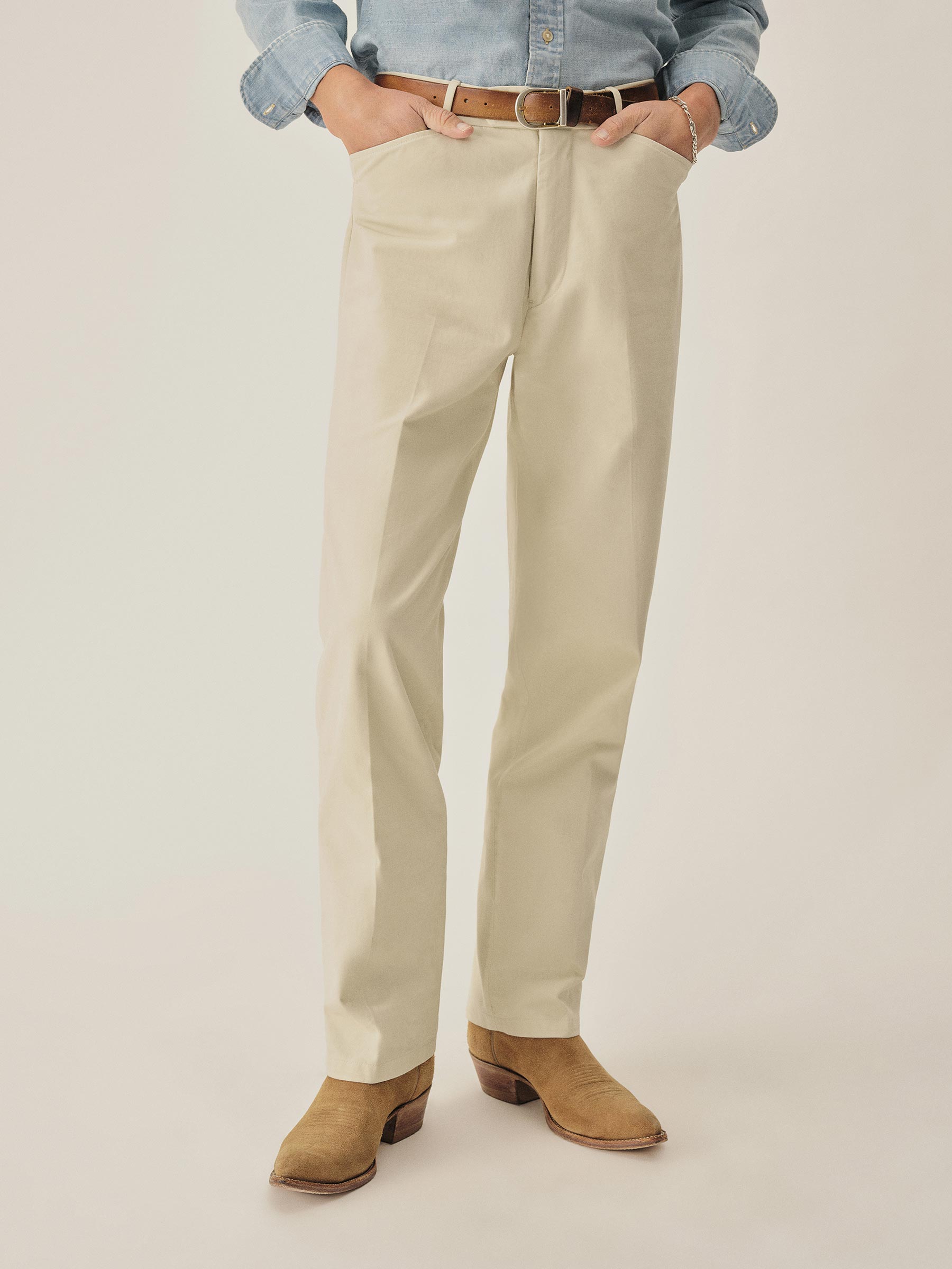 The El Camino Pant is a western-inspired trouser crafted from brushed Japanese cotton twill, built with 1960s-era frogmouth front pockets, waist tab closures, and a split waistband. Modeled after polished rodeo styles, the leg runs slim and straight from a mid-high rise down to a boot-ready opening.