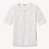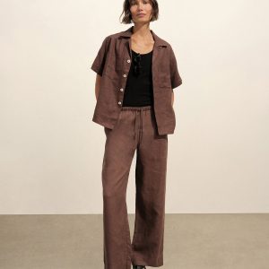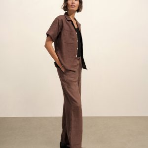 Oversized short-sleeve camp collar shirt with a cropped body, cut from a 100% linen weave. Featuring a low neckline, two front chest pockets, notched vents at sides, and a back yoke to box pleat. Finished with oversized mother of pearl buttons for a luxe, polished summer look. Garment washed for a lived-in look and feel.