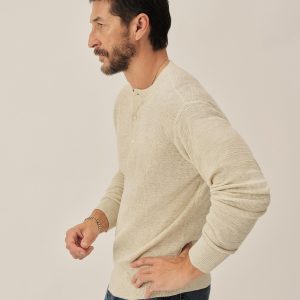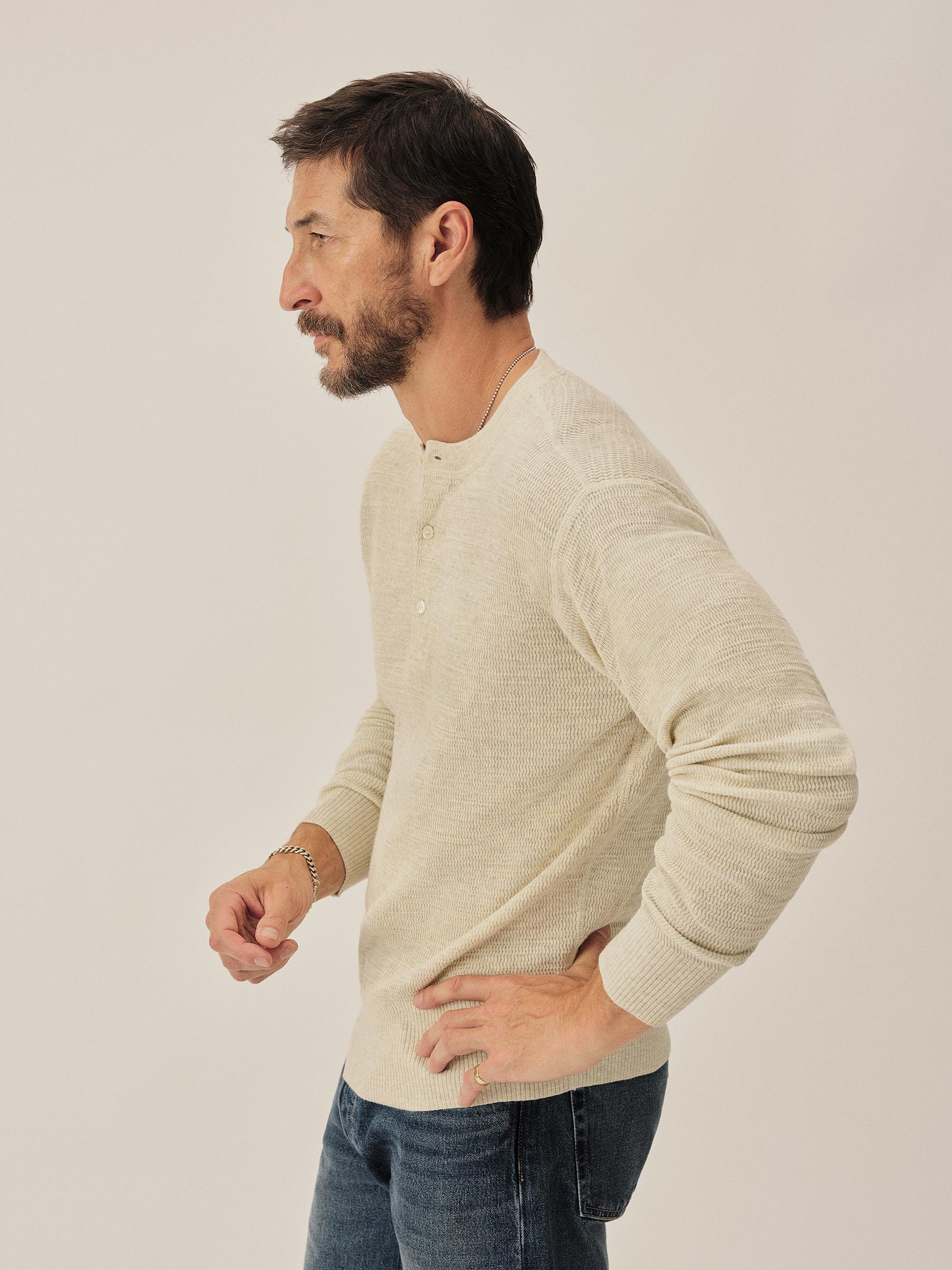 A standard fit, vintage-inspired thermal stitch henley crafted from slubby, yarn-dyed cotton. Featuring variegated rib finishes at the cuffs and bottom hem, and coverstitching along the seams. Finished with a three button shell closure.