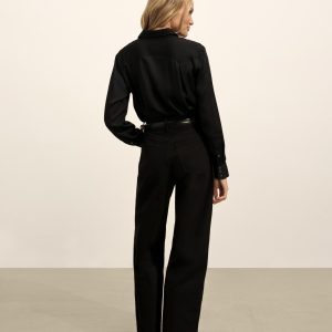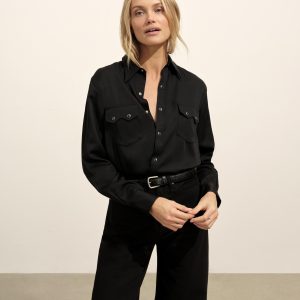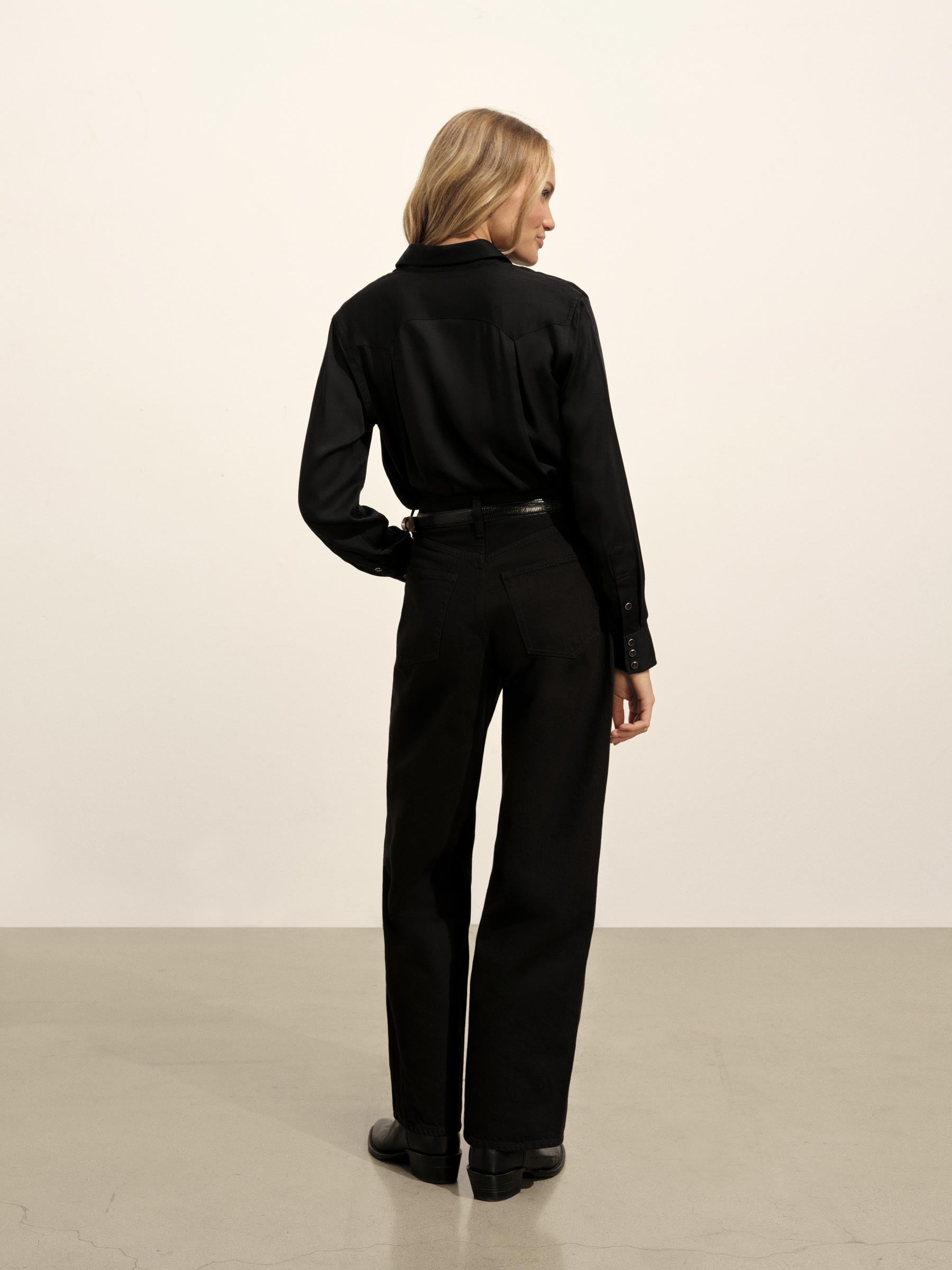 A silky, mid-century-inspired Western shirt with a relaxed body, distinct sawtooth pockets, and an arched back yoke with pleats. Cut from rayon modal and finished with French seams and pearl snaps.