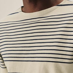 Nautical-inspired boxy fit short sleeve wide neck tee with a straight hem, longer sleeve length, drop shoulder, high neck, and wide ribbed collar. The soft cotton jersey, yarn-dyed in indigo and black sulfur stripe pattern, is about twice as heavy as our Pima tees, with tiny vertical ribs that gently glide across the skin. This is a solid, substantial stand-alone tee for cold weather that will pick up a ton of character over time.