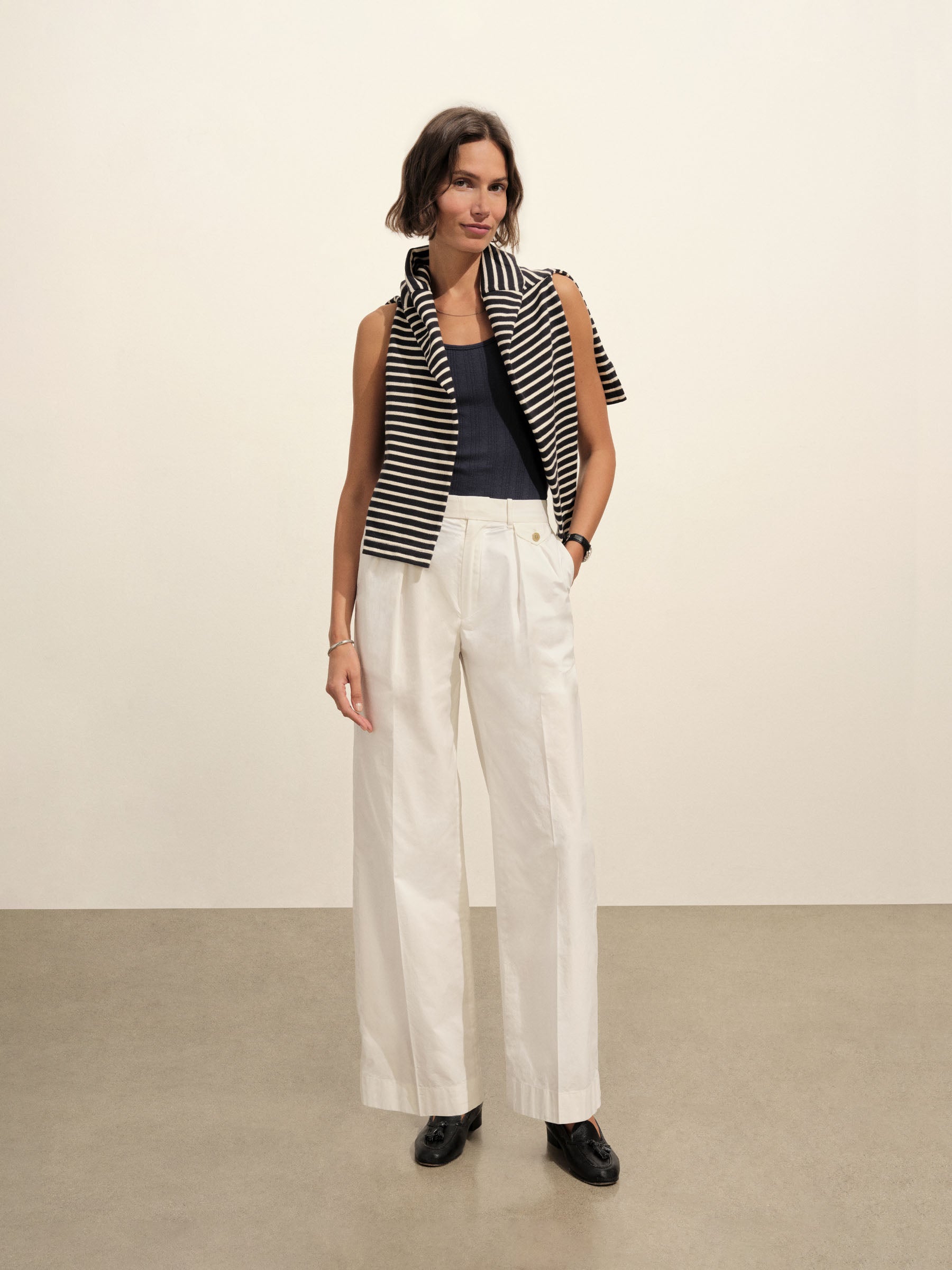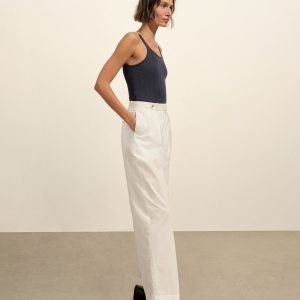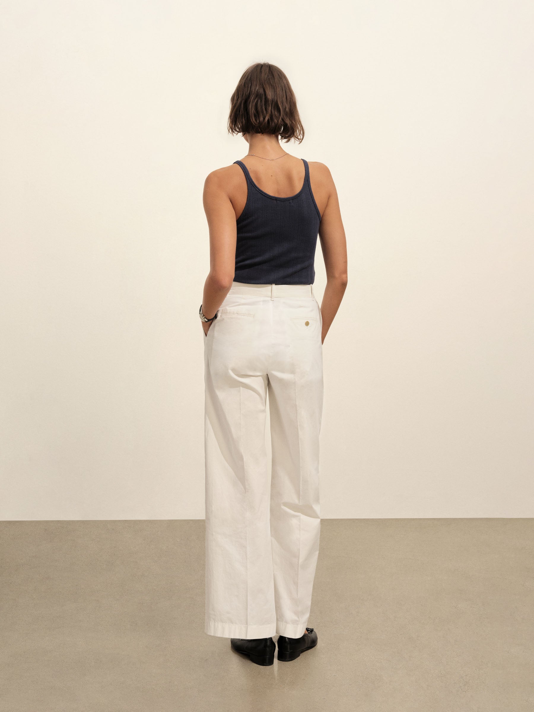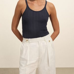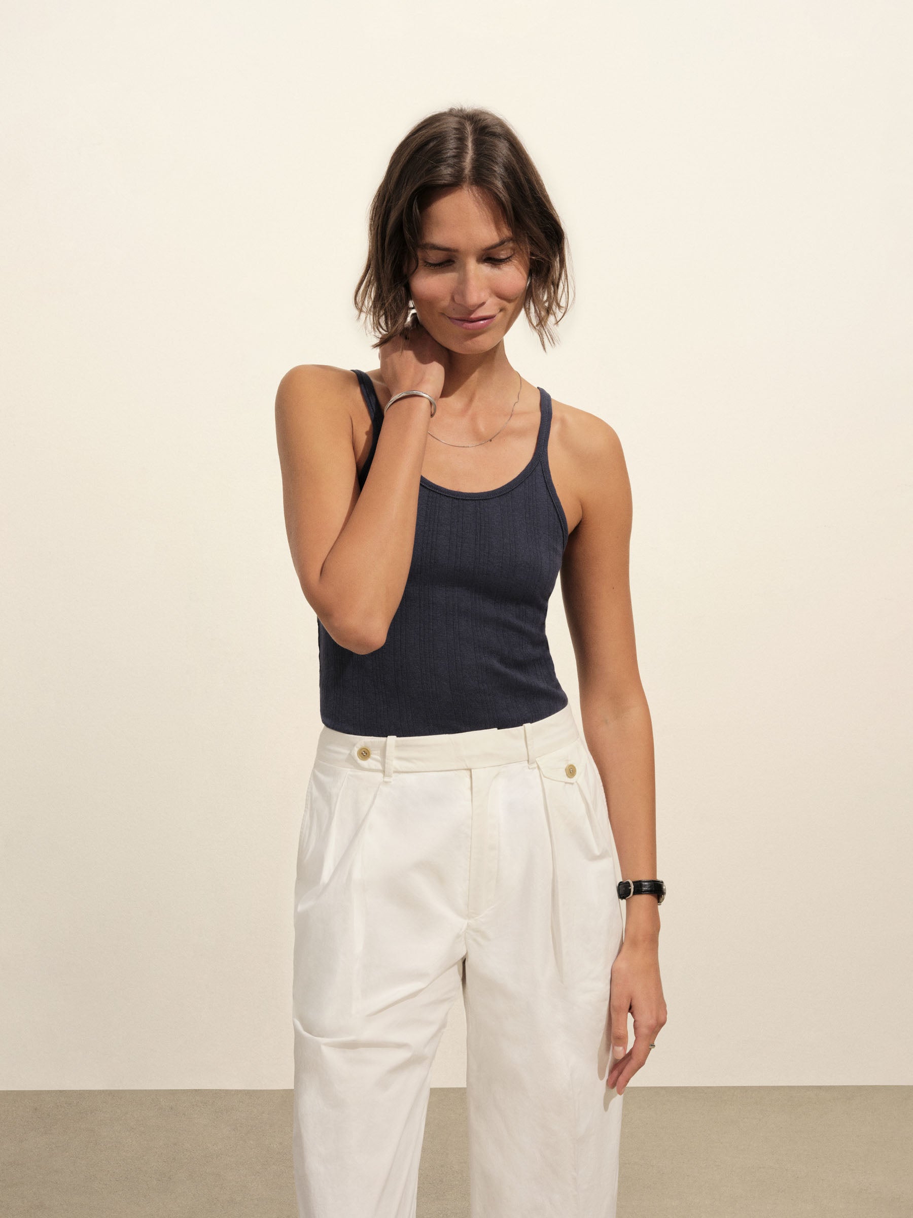 Slim-fit, vintage-inspired base tank made from a textured blend of 60% recycled cotton and 40% cotton. Features a scalloped scoop neckline, contrast rib binding, and discreet baby snaps at the shoulders to keep bra straps in place.