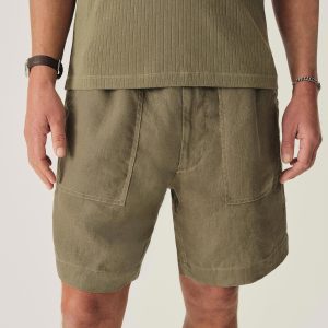 Classic fit fatigue short. This 7 oz. linen has a loose, airy weave that breathes easily, and it’s been washed for a lived-in feel. Details include two front patch pockets, two back patch pockets, an encased elastic waist with drawcord, and corozo buttons. Garment washed with enzymes and softener for a lived-in feel. Button and zip closure.