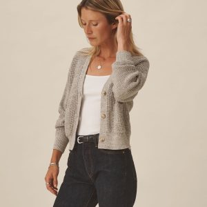 A relaxed cardigan made from marled cotton yarn and knit in a classic waffle stitch. Designed to layer over tees, it’s built with a functional front placket with urea buttons, patch pockets, and a clean V-neckline.